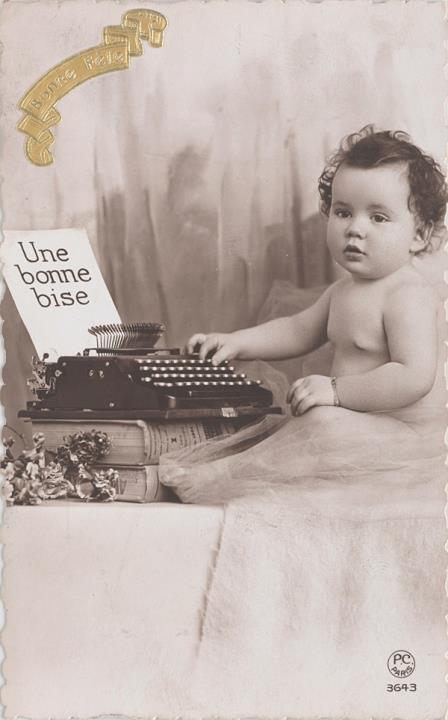 Illustrierte Postkarte; Fotografie, monochrom; Serie PC Paris 3643 Rückseite: Baby mit Schreibmaschine Vorderseite: beschrieben, datiert 04.04.1934