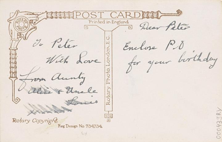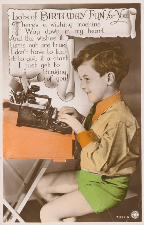 Illustrierte Postkarte; Fotografie, koloriert; Rotary Photo Nr. T599-6 Rückseite: Junge mit Schreibmaschine, Kartusche mit Text Vorderseite beschrieben