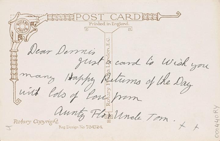 Illustrierte Postkarte; Fotografie, koloriert; Rotary Photo Nr. T599-2 Rückseite: Junge mit Schreibmaschine, Kartusche mit Text in Versform Vorderseite beschrieben