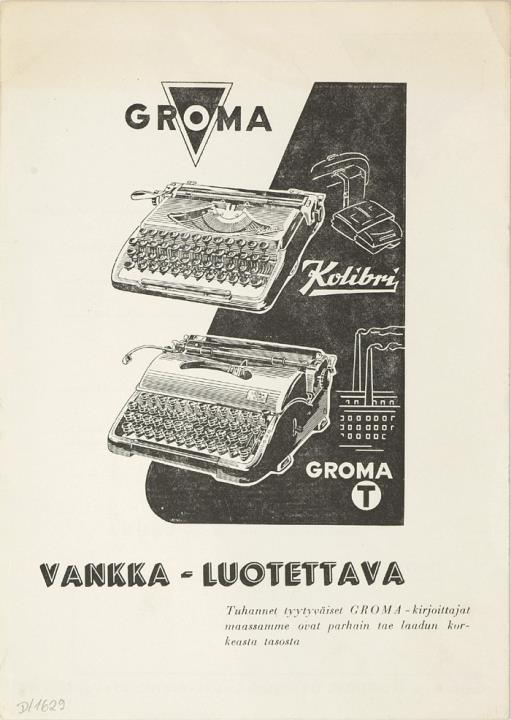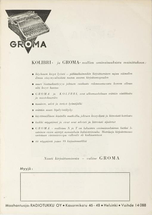 Prospekt in finnischer Sprache für Schreibmaschine Groma Kolibri und Groma T