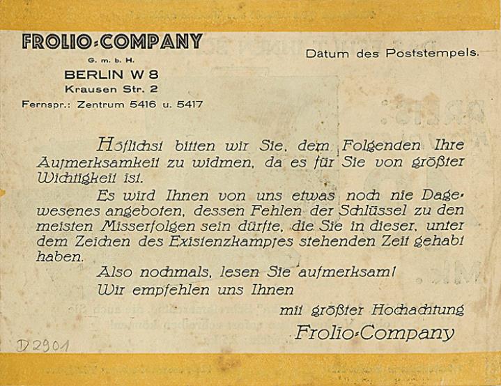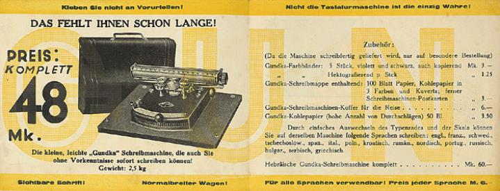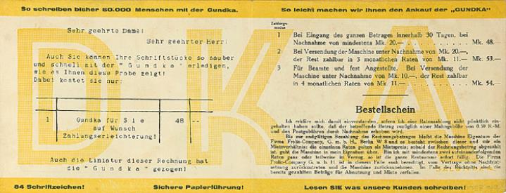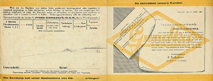 Faltprospekt für Schreibmaschine Gundka mit Bestellschein an Fa. Frolio-Company GmbH