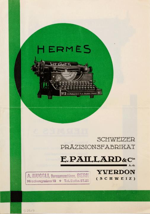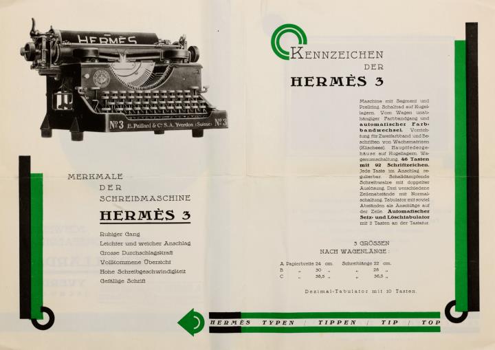 Faltprospekt für Schreibmaschine Hermes Schweizer Präzisionsfabrikat Druck: Heliogravure Sadag