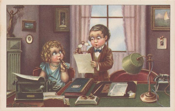 Illustrierte Postkarte; Grafik, polychrom; Serie B. 550, Grafik: A. Bertiglia Rückseite: Büroszene; Vorgesetzter und Sekretärin mit Schreibmaschine Vorderseite nicht beschrieben