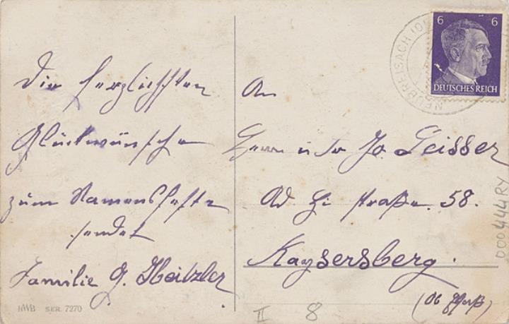 Illustrierte Postkarte; Grafik, polychrom; HWB Serie 7270 Rückseite: Junge mit Schreibmaschine, Blumen und Geschenken; beschrieben Vorderseite: beschrieben, adressiert; Briefmarke Deutsches Reich 6 RPf.; Poststempel Neubreisach