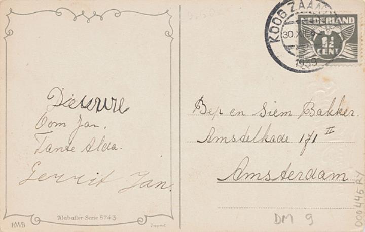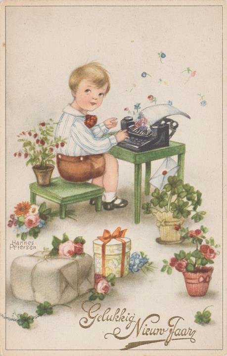 Illustrierte Postkarte; Grafik, polychrom; HWB Serie 5743 Rückseite: Junge mit Schreibmaschine, Blumen und Geschenken Vorderseite: beschrieben, adressiert; Briefmarke Nederland 1 1/2 Cent, Koog Zaandijk/30.XI.1939
