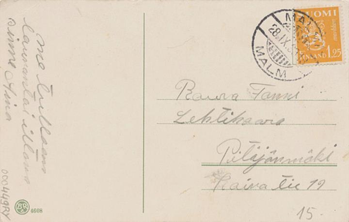 Illustrierte Postkarte; Grafik, polychrom; BR Nr. 4608 Rückseite: Mädchen mit Schreibmaschine und Blumen; beschrieben Vorderseite: beschrieben, adressiert; Briefmarke Finland 1.25; Poststempel Malm/28 IX 1933