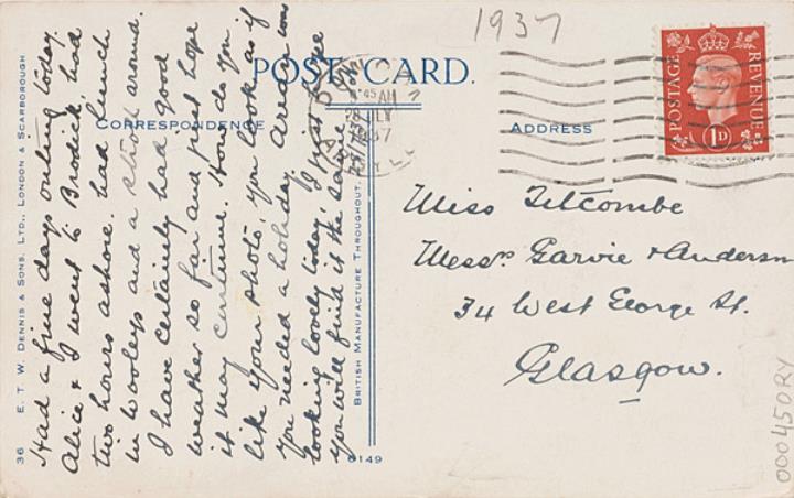 Illustrierte Postkarte; Grafik, polychrom; Nr. 6149, Grafik: Bimbi Rückseite: Mädchen mit Schreibmaschine Vorderseite: beschrieben, adressiert; Poststempel Postage Revenue (U.K.) 1 D; Poststempel 28 Jly 1937