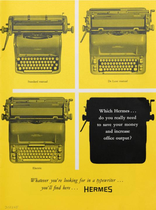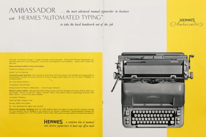 Prospekt für Schreibmaschine Hermes 8, Ambassador und Ambassador electric Nr. 933 R. Z.