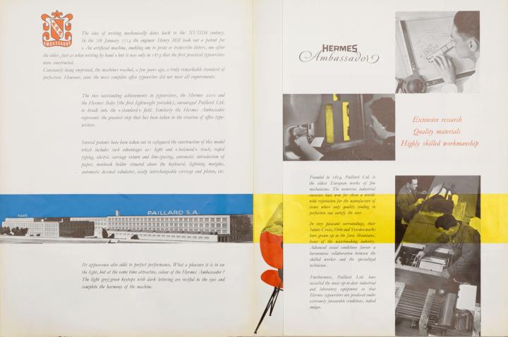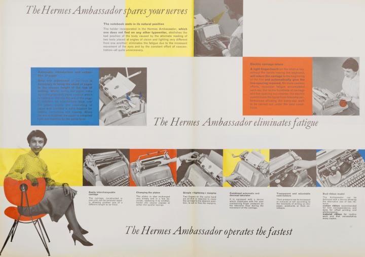 Faltprospekt für elektrische Schreibmaschine Hermes Ambassador Nr. 724 G ICL (Angl.)