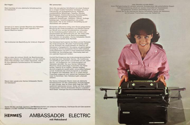 Prospekt für elektrische Schreibmaschine Hermes Ambassador Nr. 7020 A All.