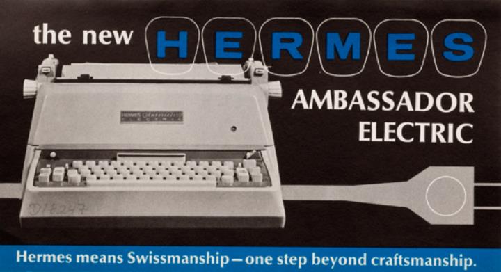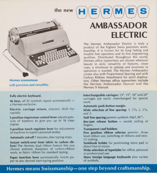 Faltprospekt für elektrische Schreibmaschine Hermes Ambassador (Februar 1965) Hermes means Swissmanship - one step beyond craftsmanship