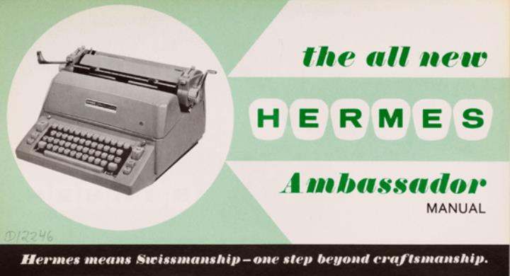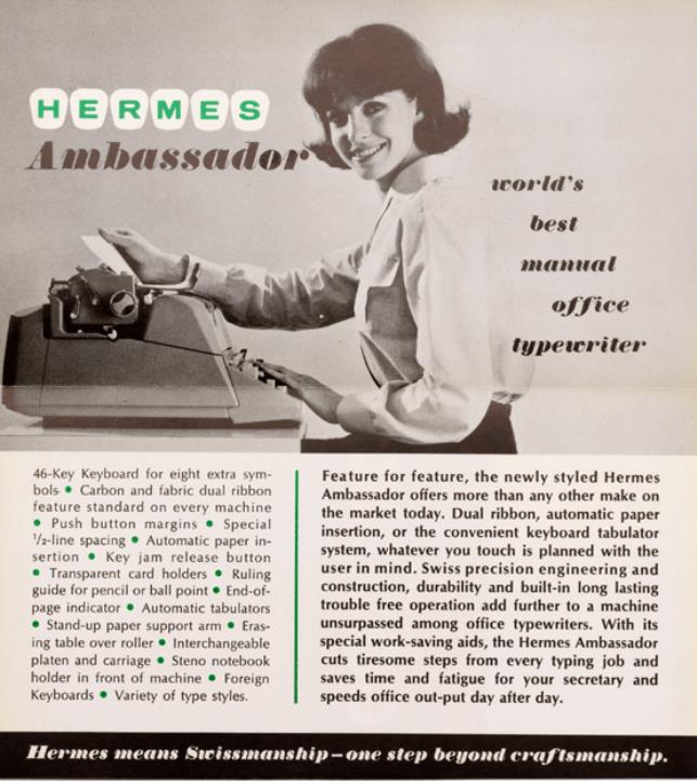 Faltprospekt für Büroschreibmaschine Hermes Ambassador (Februar 1965) Hermes means Swissmanship - one step beyond craftsmanship