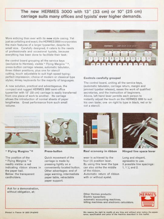 Prospekt für Schreibmaschine Hermes 3000 Nr. 3030 (Anglais)