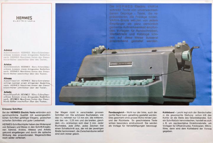Faltprospekt für elektrische Schreibmaschine Hermes Electric Varia Nr. 7023 AR.&G. (All.)