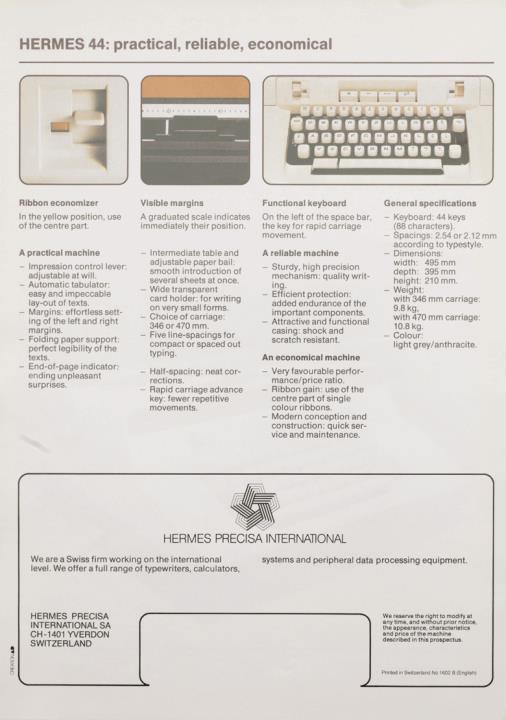 Prospekt für Schreibmaschine Hermes 44 Nr. 1602 B (English)