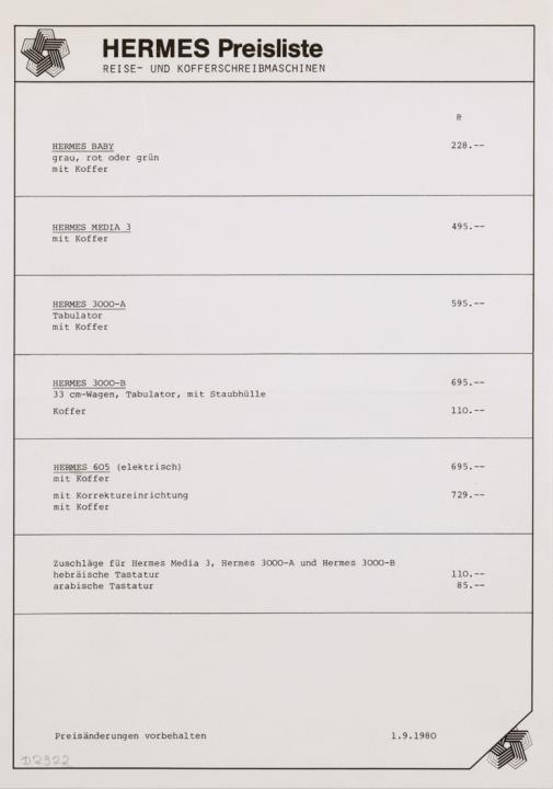 Preisliste für Reise- und Kofferschreibmaschinen Hermes Stand 01.09.1980