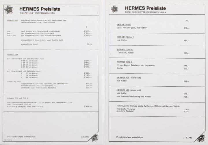 3 Preislisten für Schreibmaschine Hermes: elektrische Schreibmaschinen, Stand 01.03.1981 mechanische Schreibmaschinen, Stand 01.05.1981 Reise- und Kofferschreibmaschinen, Stand 15.06.1981