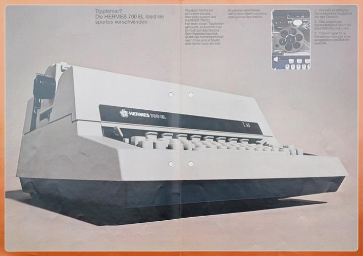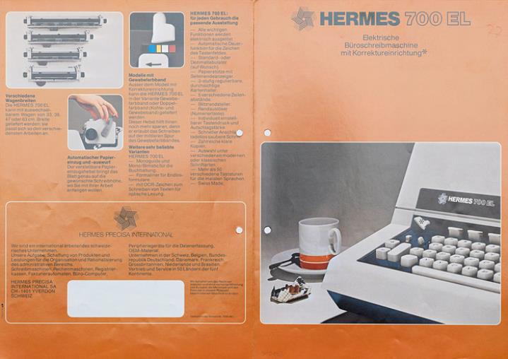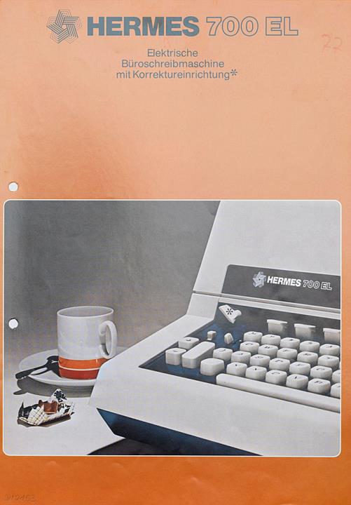 Faltprospekt für Schreibmaschine Hermes 700 EL Elektrische Büroschreibmaschine mit Korrektureinrichtung* Nr. 8056 (All.) Datum handschriftlich vermerkt