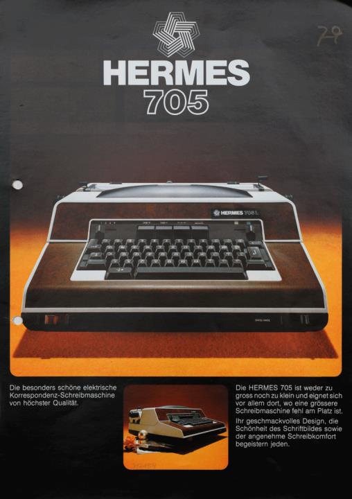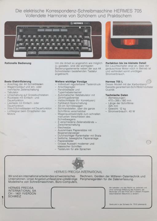 Prospekt für elektrische Schreibmaschine Hermes 705/705L Nr. 7513 (allemand)