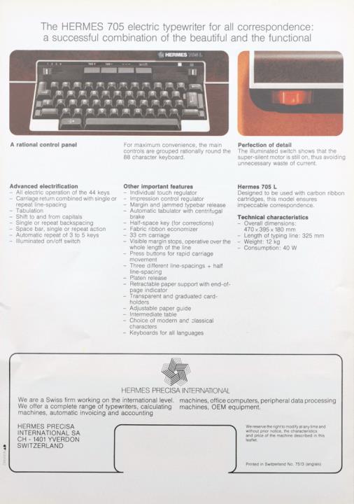 Prospekt für elektrische Schreibmaschine Hermes 705/705L Nr. 7513 (anglais)