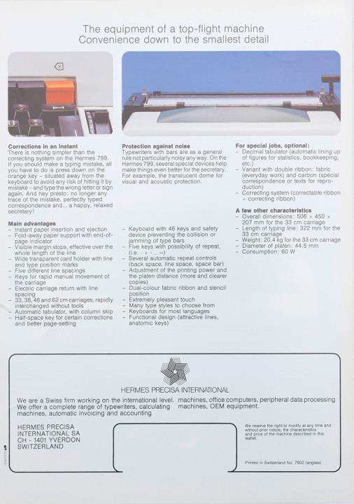 Prospekt für elektrische Schreibmaschine Hermes 799 Nr. 7902 (anglais)
