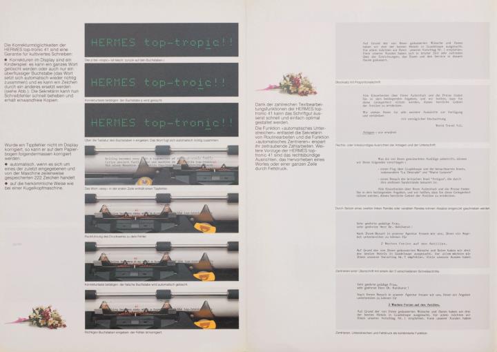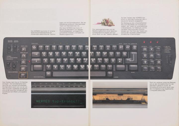 Faltprospekt für elektronische Schreibmaschine Hermes top-tronic 41 Speicherschreibmaschine mit Display Nr. 8412 (Allemagne-Autriche) Datum handschriftlich vermerkt