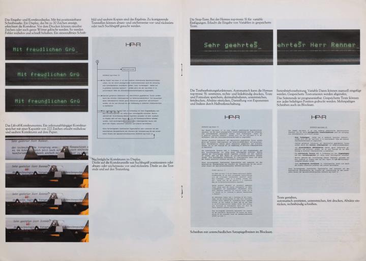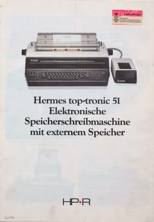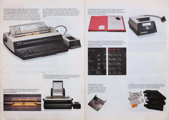 Prospekt für Schreibmaschine Hermes top-tronic 51 Elektronische Speicherschreibmaschine mit externem Speicher Nr. MSB 10.82/003