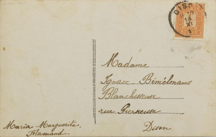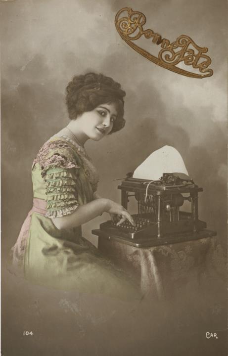 Illustrierte Postkarte (Frohes Fest); Fotografie, koloriert; Serie 104 CAR Rückseite: Frau mit Schreibmaschine, Blick zum Betrachter Vorderseite: beschrieben; adressiert an Madame Bémélmans, Dison; Briefmarke Belgique/Belgie 1 c.; Poststempel unklar