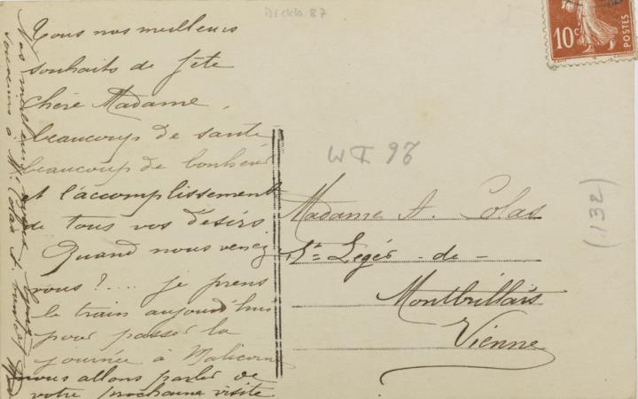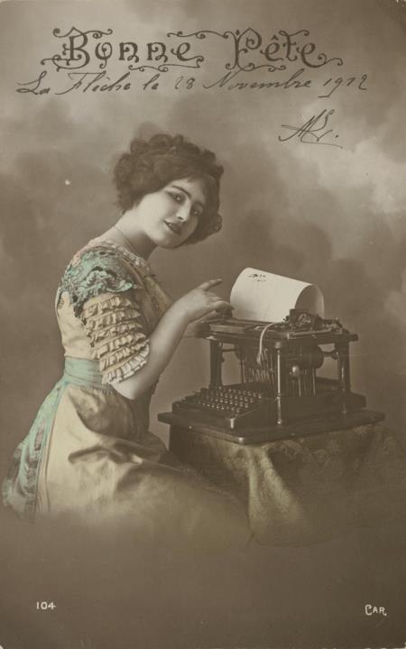 Illustrierte Postkarte (Frohes Fest); Fotografie, koloriert; Serie 104 CAR Rückseite: Frau mit Schreibmaschine, Blick zum Betrachter; handgeschriebener Text: La Fléche le 28 Novembre 1912 Vorderseite: beschrieben; adressiert an Madame A. Colas, Vienne; Briefmarke Postes Francaises 10c (abgetrennt)