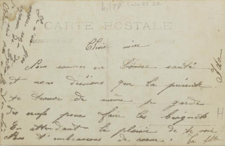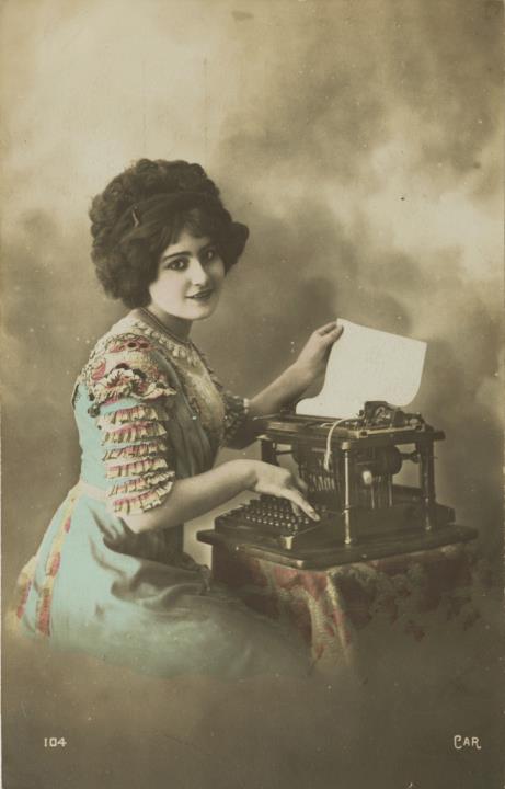 Illustrierte Postkarte; Fotografie, koloriert; Serie 104 CAR Rückseite: Frau mit Schreibmaschine, Blick zum Betrachter Vorderseite beschrieben