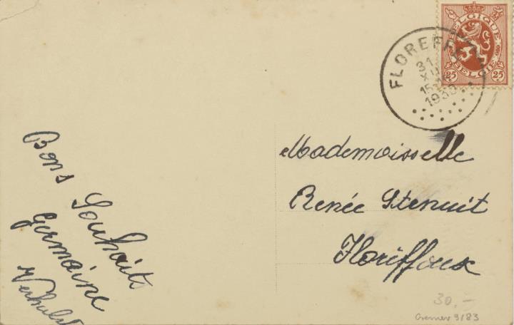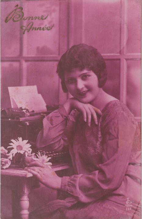 Illustrierte Postkarte; Fotografie, getönt; Serie LC Paris 127 Rückseite: Frau mit Schreibmaschine, Blick zum Betrachter, Blumen als Dekoration Vorderseite: beschrieben; adressiert an Mademoisselle Stenuit, Floreffaux; Briefmarke Postes Belgique 25c; Poststempel Floreffe 31 XII 1935