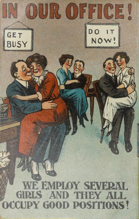 Illustrierte Postkarte; Grafik, polychrom; Nr. 178 Rückseite: Büroszene; drei Paare aus weiblichen und männlichen Büromitarbeitern; weiterer Text: We employ several girls and they all occupy good positions! Vorderseite nicht beschrieben
