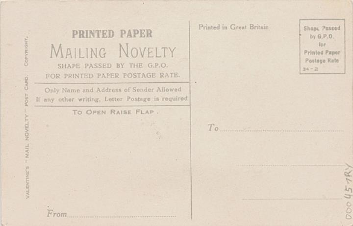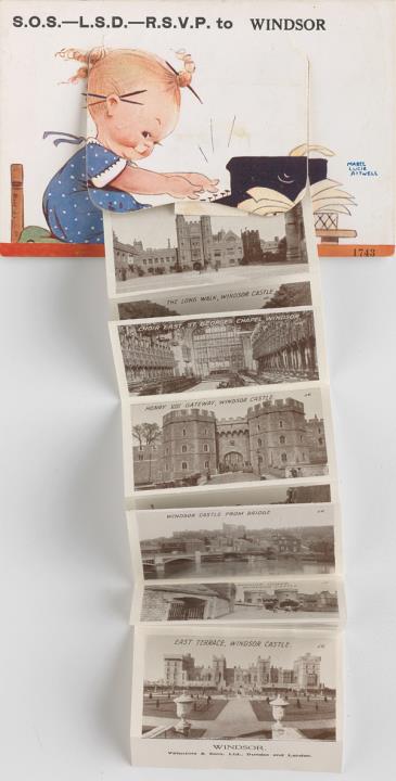 Illustrierte Postkarte mit Inhalt; Grafik, Fotografie, polychrom Valentines Mail Novelty Post Card, Grafik: Mabel Lucie Attwell Rückseite: Mädchen mit Schreibmaschine; unter dem Klappfenster ein ausziehbares Leporello mit 12 Ansichten von Schloss Windsor Vorderseite nicht beschrieben