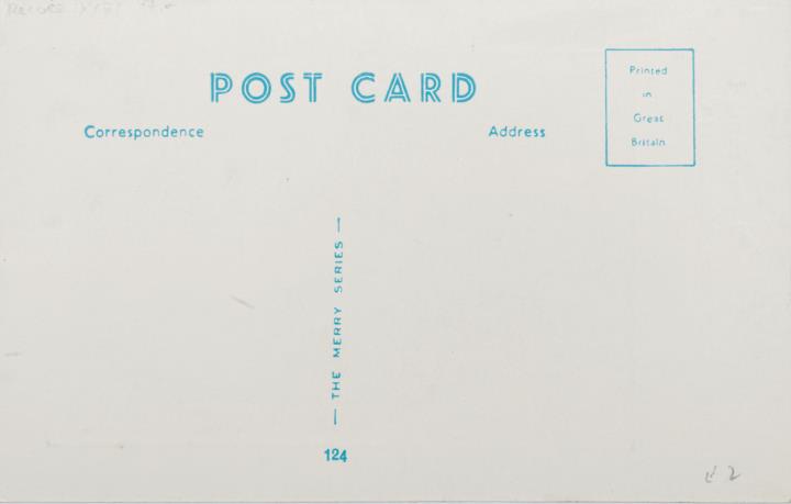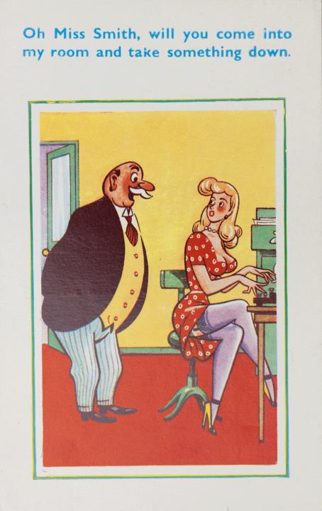 Illustrierte Postkarte; Grafik, polychrom; The Merry Series Nr. 124 Rückseite: Büroszene; Sekretärin in kurzem Kleid mit Schreibmaschine, Vorgesetzter betritt das Vorzimmer Vorderseite nicht beschrieben