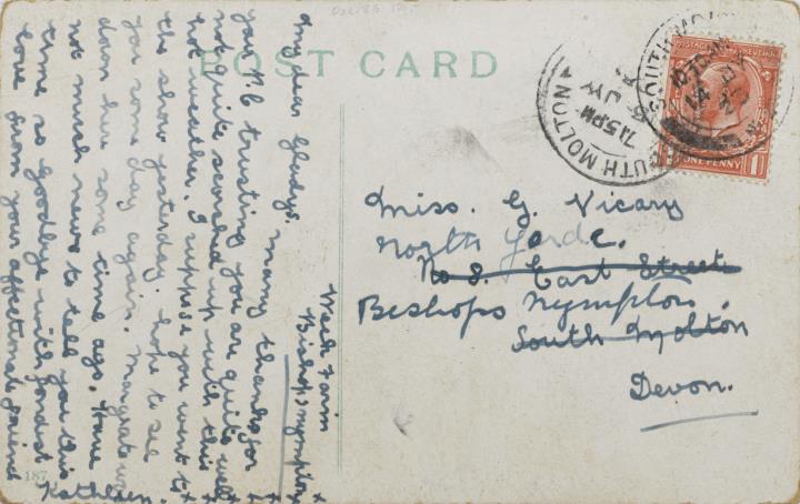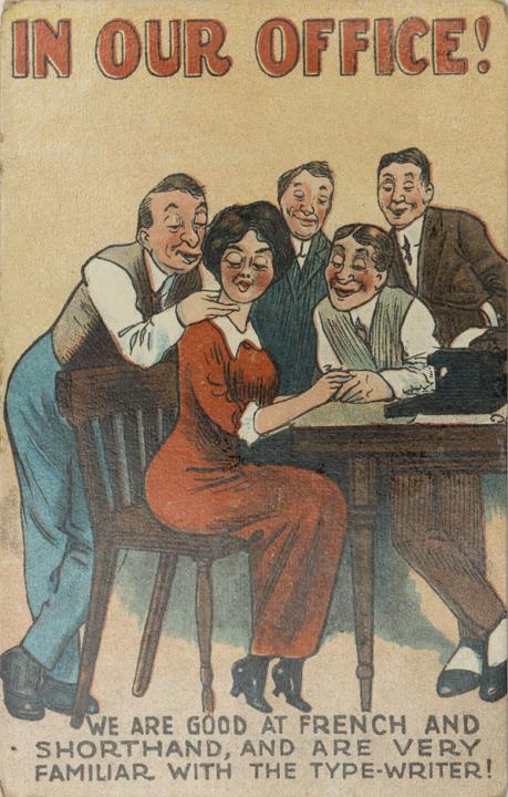 Illustrierte Postkarte; Grafik, polychrom; Nr. 187 Rückseite: Büroszene; Sekretärin von vier männlichen Kollegen umworben; weiterer Text: We are good at French and shorthand, and are very familiar with the type-writer! Vorderseite: beschrieben; adressiert an Miss Vicary, Devon; Briefmarke Postage Revenue (U.K.) One Penny; Poststempel South Molton 14 Jy 1923