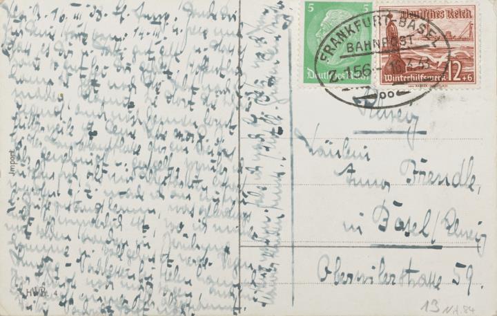 Illustrierte Postkarte; Grafik, polychrom; Grafik: Mabel Lucie Attwell Rückseite: Mädchen mit Schreibmaschine Vorderseite: beschrieben; adressiert an Vräulein Frendle, Basel; Briefmarken Deutsches Reich 5 RPf. / Winterhilfswerk 12+6 RPf.; Poststempel Frankfurt Basel Bahnpost 16.6.1933