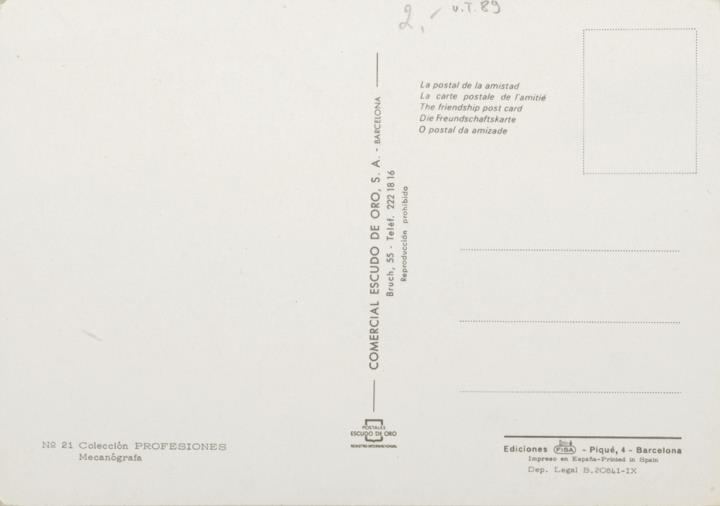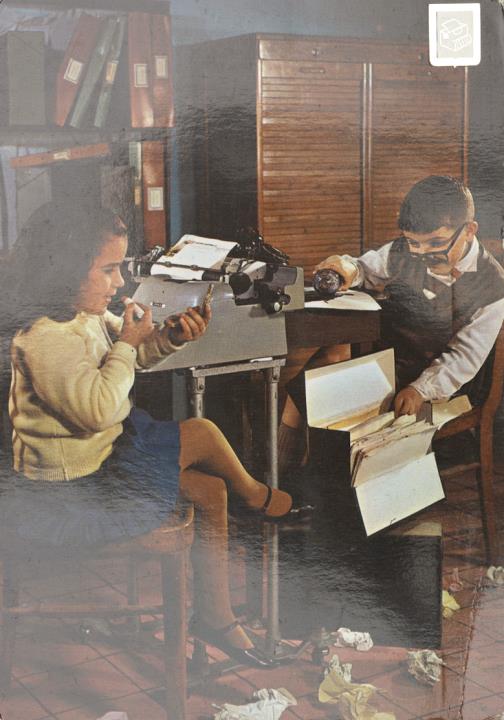 Illustrierte Postkarte; Fotografie, polychrom; Nr 21 Colección Profesiones Mecanógrafa Rückseite: Büroszene; Mädchen/Sekretärin mit Schreibmaschine und Lippenstift, Junge/Chef mit Buch als Sitzunterlage und Brille; Ecke oben links mit Schreibmaschinenemblem Vorderseite nicht beschrieben