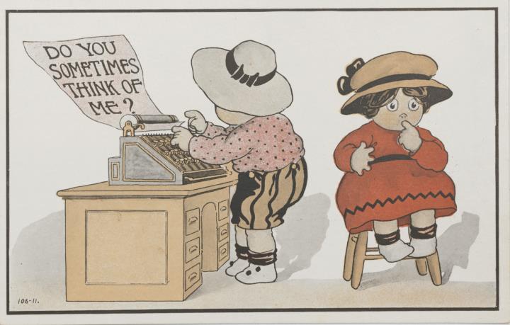 Illustrierte Postkarte; Grafik, polychrom; Nr. 106-11 Rückseite: Junge und Mädchen mit Schreibmaschine Vorderseite nicht beschrieben