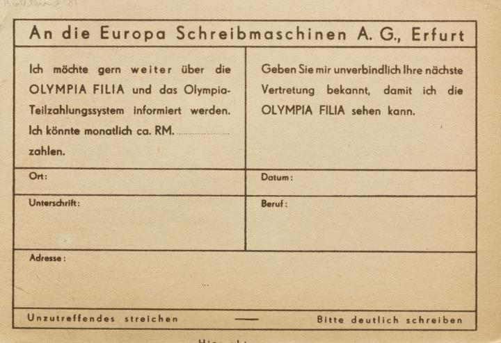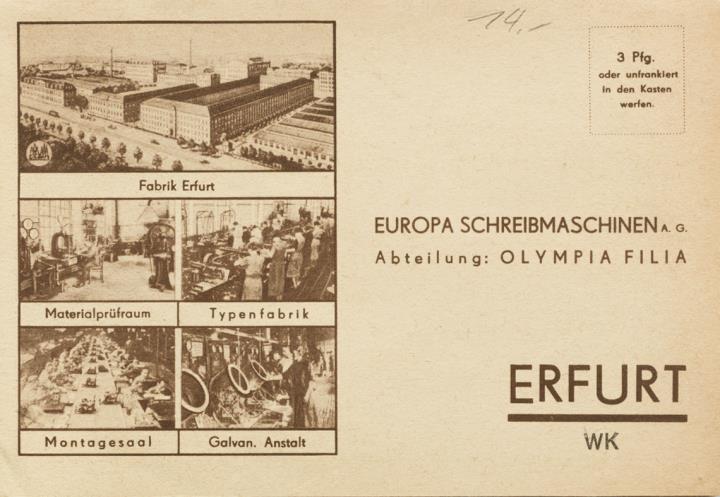 Antwortkarte; monochrom Vorderseite: Ansicht des Unternehmens Europa Schreibmaschinen AG, Erfurt; vorgedruckte Anschrift Rückseite: vorgedruckter Text (Informationsanfrage zu Schreibmaschine Olympia Filia)