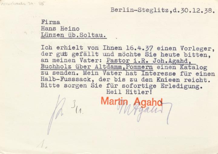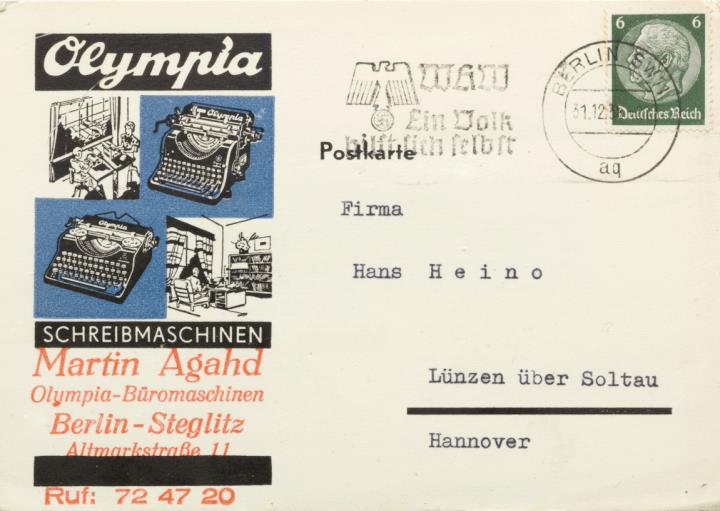 Postkarte mit Werbebild; Grafik, polychrom Vorderseite: Anschrift Firma Hans Heino, Hannover; Briefmarke Deutsches Reich 6 RPf.; Poststempel Berlin/31.12.38 Rückseite beschrieben