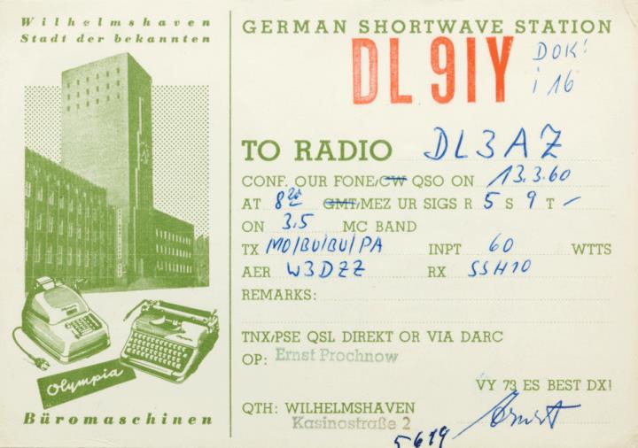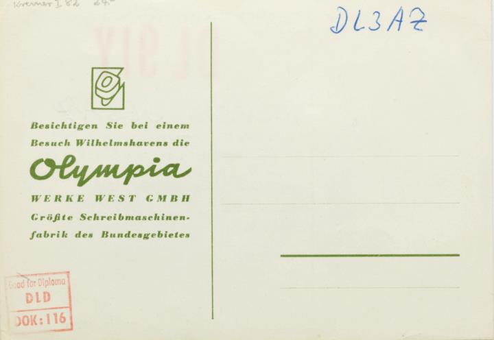 Postkarte mit Werbebild, QSL-Karte; Grafik, monochrom Vorderseite mit Reklame: Besichtigen Sie [...] die Olympia Werke West GmbH Rückseite: beschrieben; German Shortwave Station Funkempfangsbestätigung