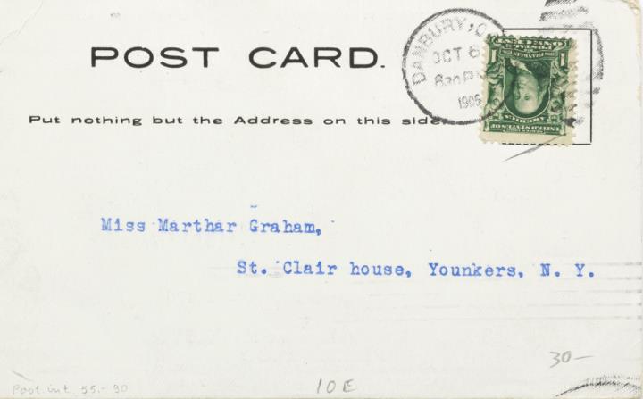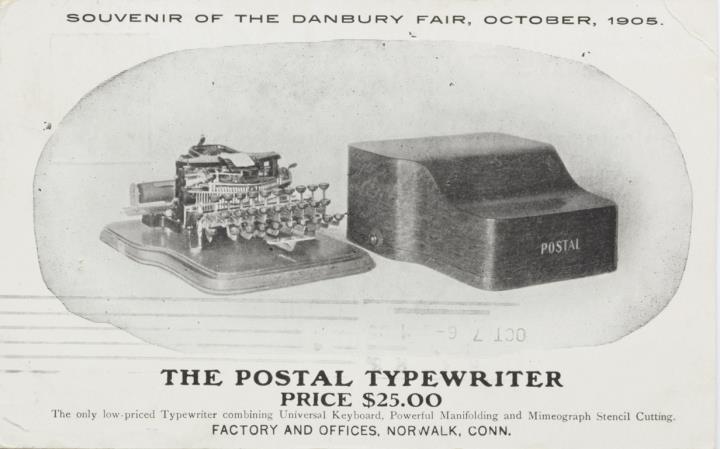 Werbepostkarte; Fotografie, monochrom Rückseite: Schreibmaschine Postal mit Koffer; Text: Souvenir of the Danbury Fair, October 1905 Vorderseite: adressiert an Miss Graham, Younkers/NY; Briefmarke U.S. Postage One Cent; Poststempel Danbury/Oct 6 1906