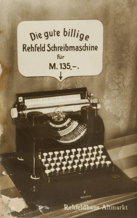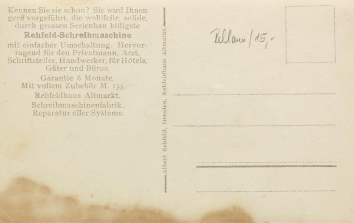 Werbepostkarte; Fotografie, monochrom Rückseite: Schreibmaschine Albert Rehfeld, Dresden; weiterer Text: Rehfeldhaus Altmarkt Vorderseite mit Werbetext