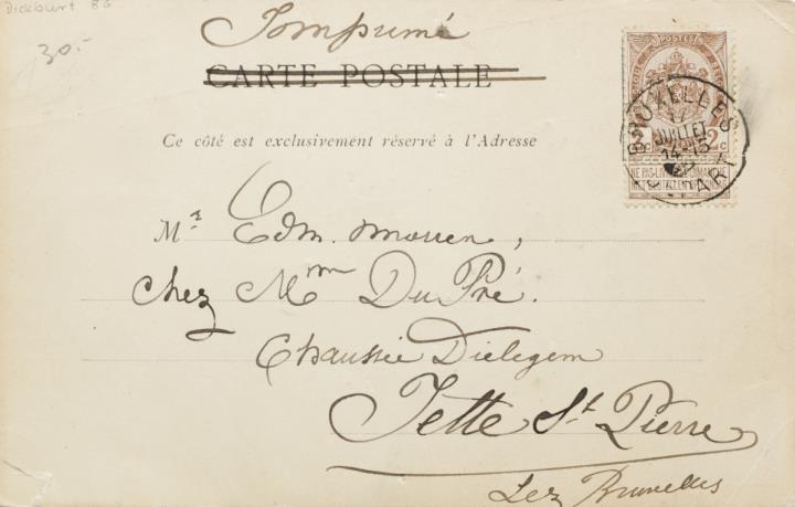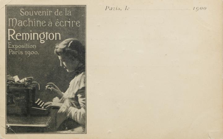 Werbepostkarte; Grafik, monochrom Rückseite: Frau mit Schreibmaschine Remington; weiterer Text: Exposition Paris 1900; Leerfläche zur Beschriftung Vorderseite: adressiert; Briefmarke Postes Belgique 2c; Poststempel Bruxelles 17 Juillet 14-15