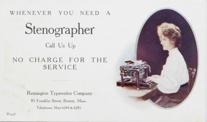 Werbepostkarte; Grafik, polychrom; Nr. 2436 Rückseite: Frau/Sekretärin mit Schreibmaschine Remington; weiterer Text: No charge for the service Vorderseite nicht beschrieben