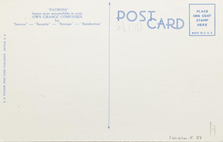 Illustrierte Postkarte; Grafik, polychrom; Nr. 64392 Rückseite: Büroansicht; Sekretärinnen mit Schreibmaschine, weiterer Text: National Grange Mutual Liability and Fire Insurance Companies, Keene, New Hampshire Vorderseite: Werbetext; nicht beschrieben