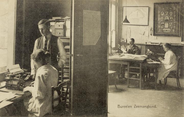 Illustrierte Postkarte; Fotografie, monochrom; Nr. 22 Rückseite: Büroansicht; Mitarbeiter und Sekretärin mit Schreibmaschine im Vorzimmer, Vorgesetzter und Sekretärin mit Schreibmaschine im Hauptbüro Vorderseite nicht beschrieben