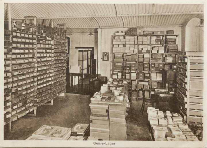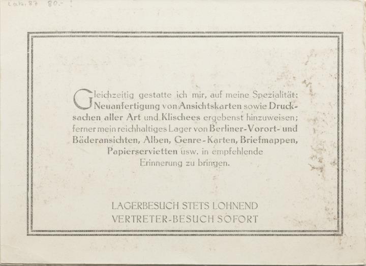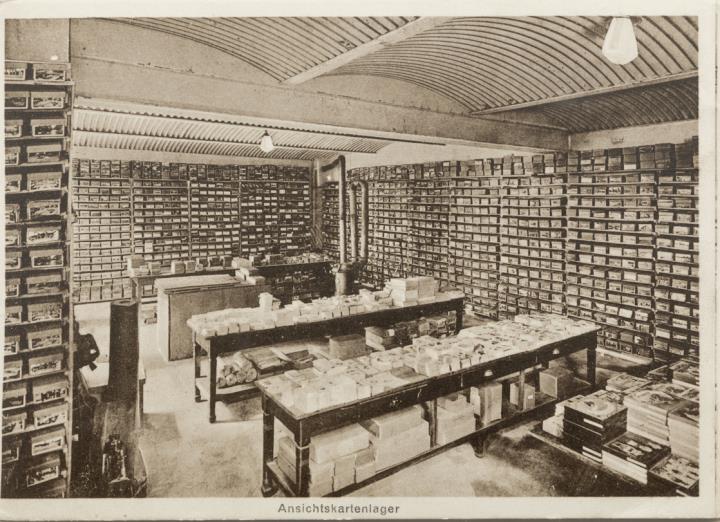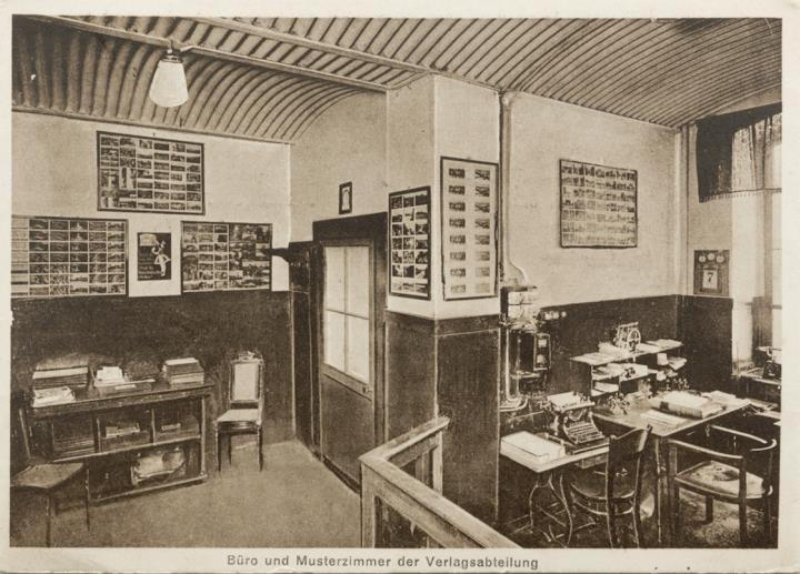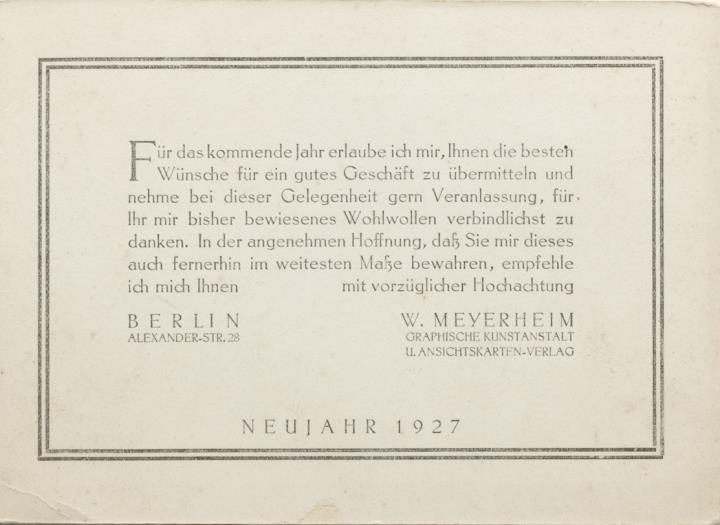 Werbekarte (Leporello) des W. Meyerheim Graphische Kunstanstalt und Illustrierte Postkarten-Verlag, Berlin; monochrom Rückseite: drei Fotoansichten: Genre-Lager, Büro- und Musterzimmer der Verlagsabteilung, Illustrierte Postkartenlager Vorderseite: drei Seiten Glückwunsch- und Werbetext