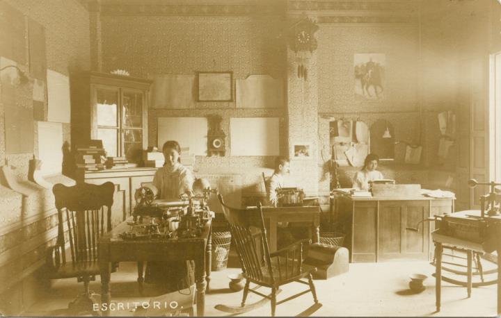 Illustrierte Postkarte; Fotografie, monochrom Rückseite: ein Mann und zwei Frauen in einer Schreibstube mit verschiedenen Büro- und Schreibgeräten; Karte "Plano de la Habana" an der Wand hängend Vorderseite nicht beschrieben