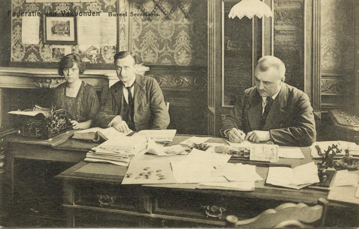 Illustrierte Postkarte; Fotografie, monochrom Rückseite: Büroansicht; Sekretärin mit Schreibmaschine Ideal und zwei männlichen Mitarbeitern Vorderseite nicht beschrieben
